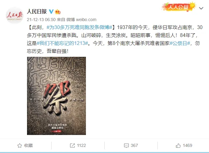 显示缅怀悼念。因为今天 12 月 13 日是国家公祭日。